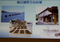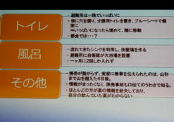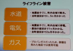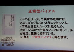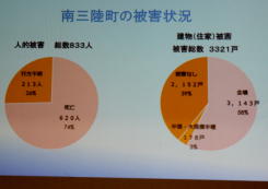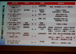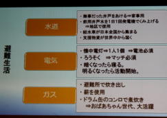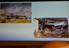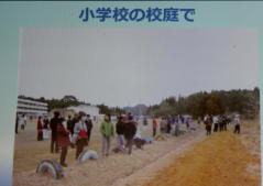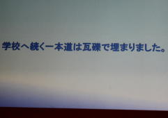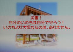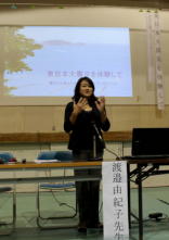 | 日時 平成28年11月2日(水) 19時00分〜20時30分 講師 渡邊由紀子 (震災体験者) 場所 操南中学校 主催 操南中学校区青少年育成協議会 震災体験者であり現在岡山に移住され牛窓で牡蠣養殖にたずさわっていらっしゃる「渡邊由紀子」様から、体験談を聞く 機会があった。 渡邊様は東京出身、南三陸町に嫁がれ9年3人の子どもを育てられていた。 あの日渡邊様は小学校1 年生のお子さんとピアノ教室で待ち合わせの予定で待機中であった。 その時地震にあわれ30分後に襲ってきた津波か ら命からがら助かった体験を赤裸々に語られた。 小1の子どもが下校途中学校に引返させられた地域の力、一方で地震の時どうするか家族で話し合い行動に移せる訓 練が出来ていなかった事を教訓として示して頂いた。 講演で使われた写真を参考に地域の方々に防災への取り組みを先ず家庭から始めて頂きたいと感じた。 山口 |